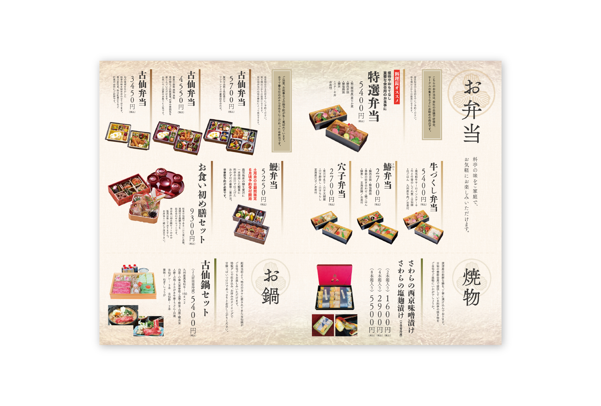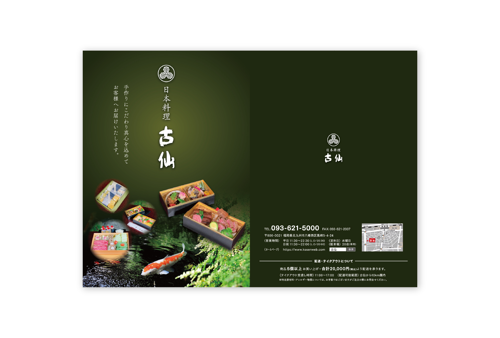日本料理 古仙さまで提供されている、お弁当のみのメニューチラシを制作させていただきました。